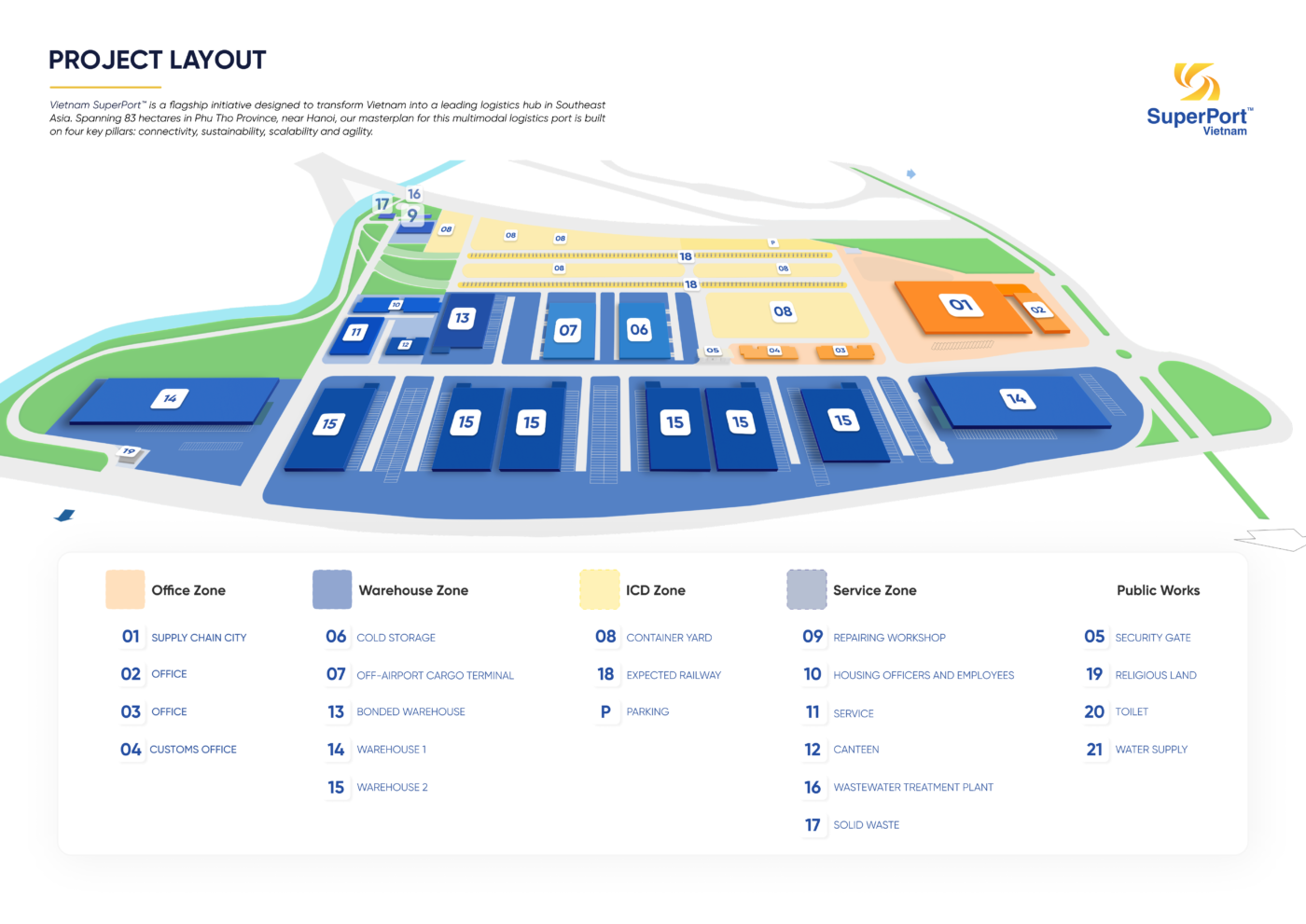 Vietnam SuperPort™ is a flagship initiative designed to transform Vietnam into a leading logistics hub in Southeast Asia. Spanning 83 hectares in Phu Tho Province, near Hanoi, our masterplan for this multimodal logistics port is built on four key pillars: connectivity, sustainability, scalability and agility.